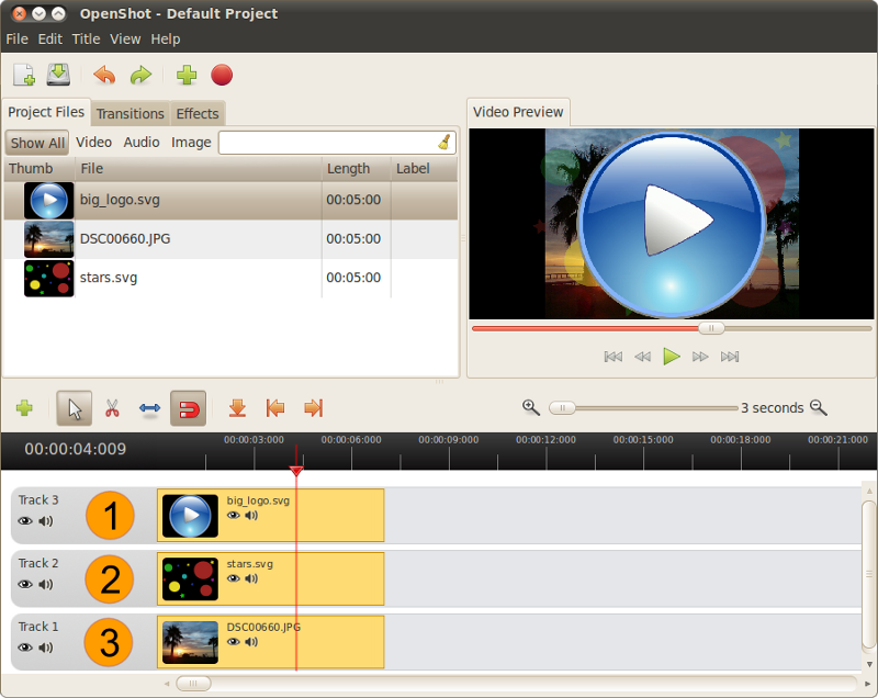 Here is the main screen in OpenShot. It contains three different layers (also called "tracks") at the bottom of the screen (labeled 1, 2, and 3). These tracks behave much like layers of paper on your desk: the bottom track is covered up by the track directly above it, and that track is covered up by the one above it, and so on, for as many tracks as you choose to add.