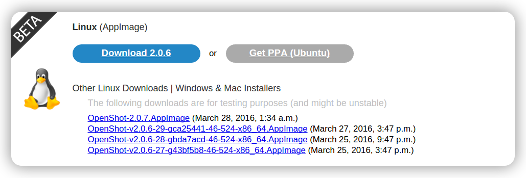 I’m very excited to debut a new Linux version of OpenShot 2.0, using the AppImage format. This format uses a single file to download, mark as executable, and then launch. All needed dependencies are included in this file, and it does not need to be “installed”. This is similar to the Mac DMG approach, and works with the latest version of Arch, Debian, Fedora, Gentoo, openSUSE, Ubuntu (and probably more, but I've actually tested those).